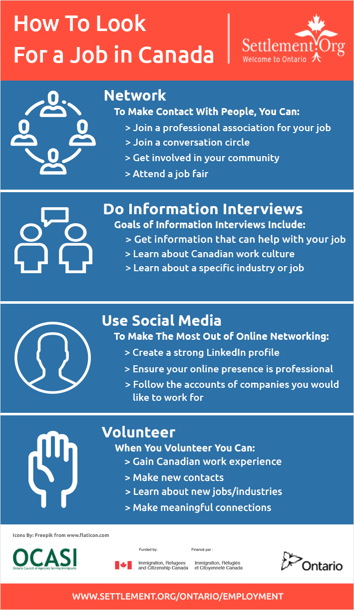 Some strategies for looking for a job in Canada include networking, conducting information interviews, using social media and volunteering.